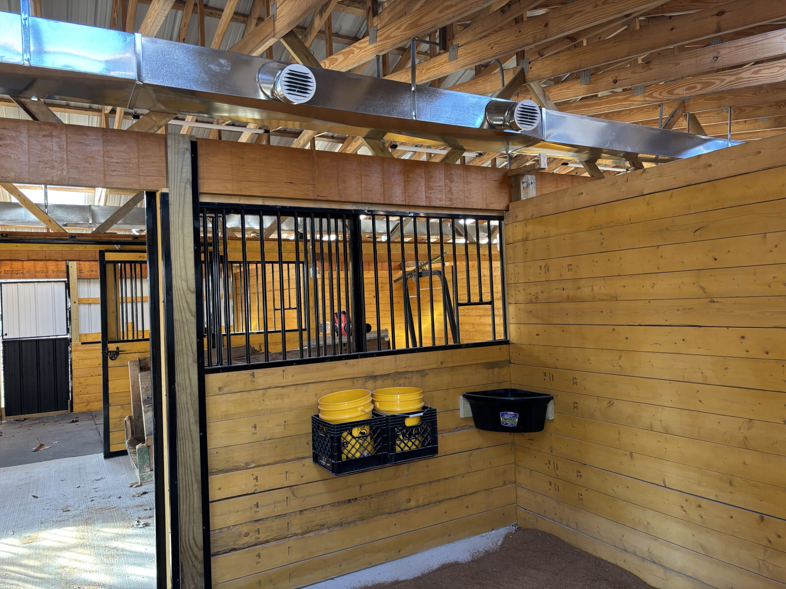 We have 4 boarding barns which include: box stalls, stalls with window, stalls with private runs, stalls on 1/8 acre paddocks with attached tack room. We also have pasture boarding. Convenient tack and wash rooms inside barn and an outside wash rack. Pasture turnout available for extra charge. Board includes grain and hay twice a day at 7:00 a.m. and 4:00 p.m. Lessons available.